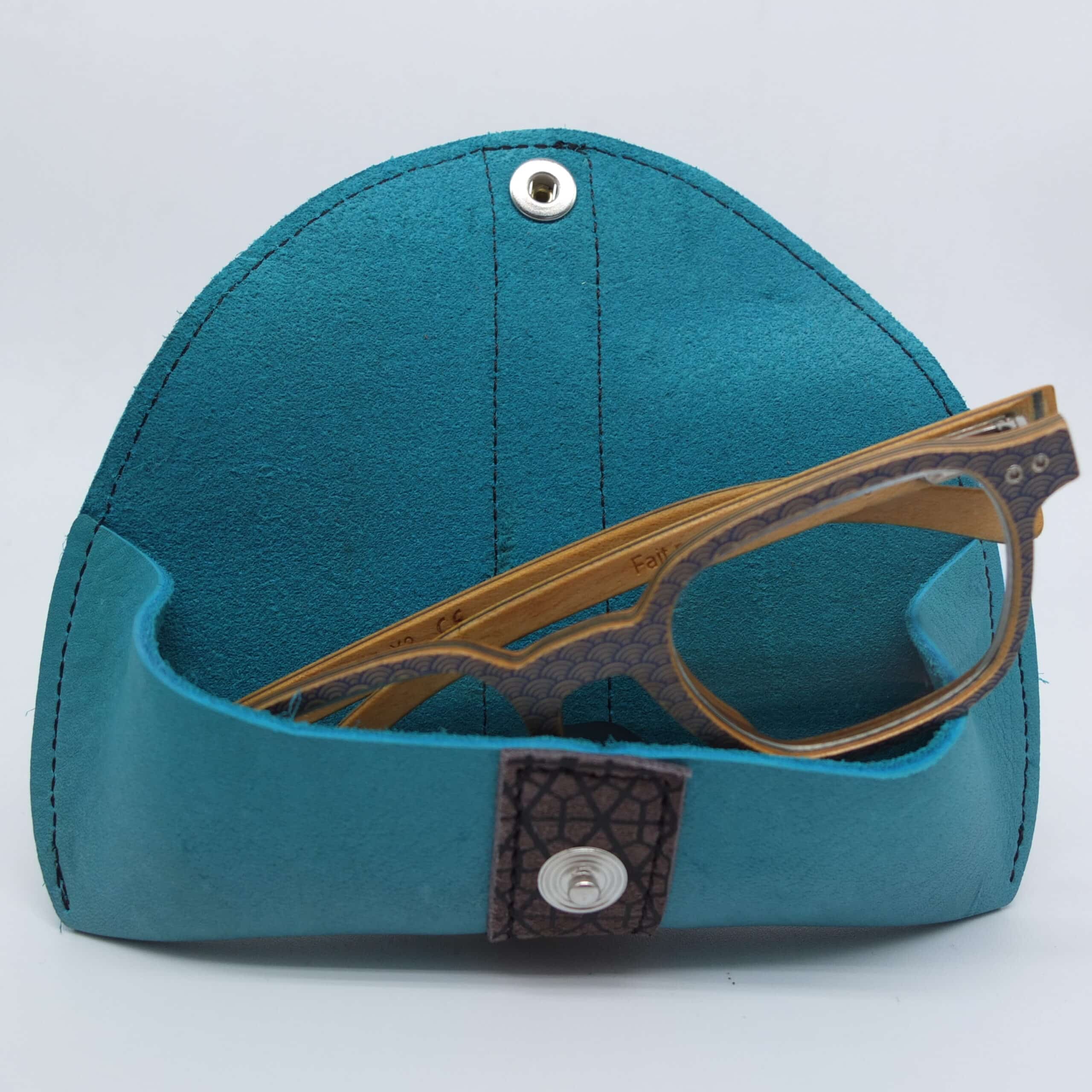 Étui à lunettes en cuir bleu et bande gris sérigraphiée – Élégance et protection