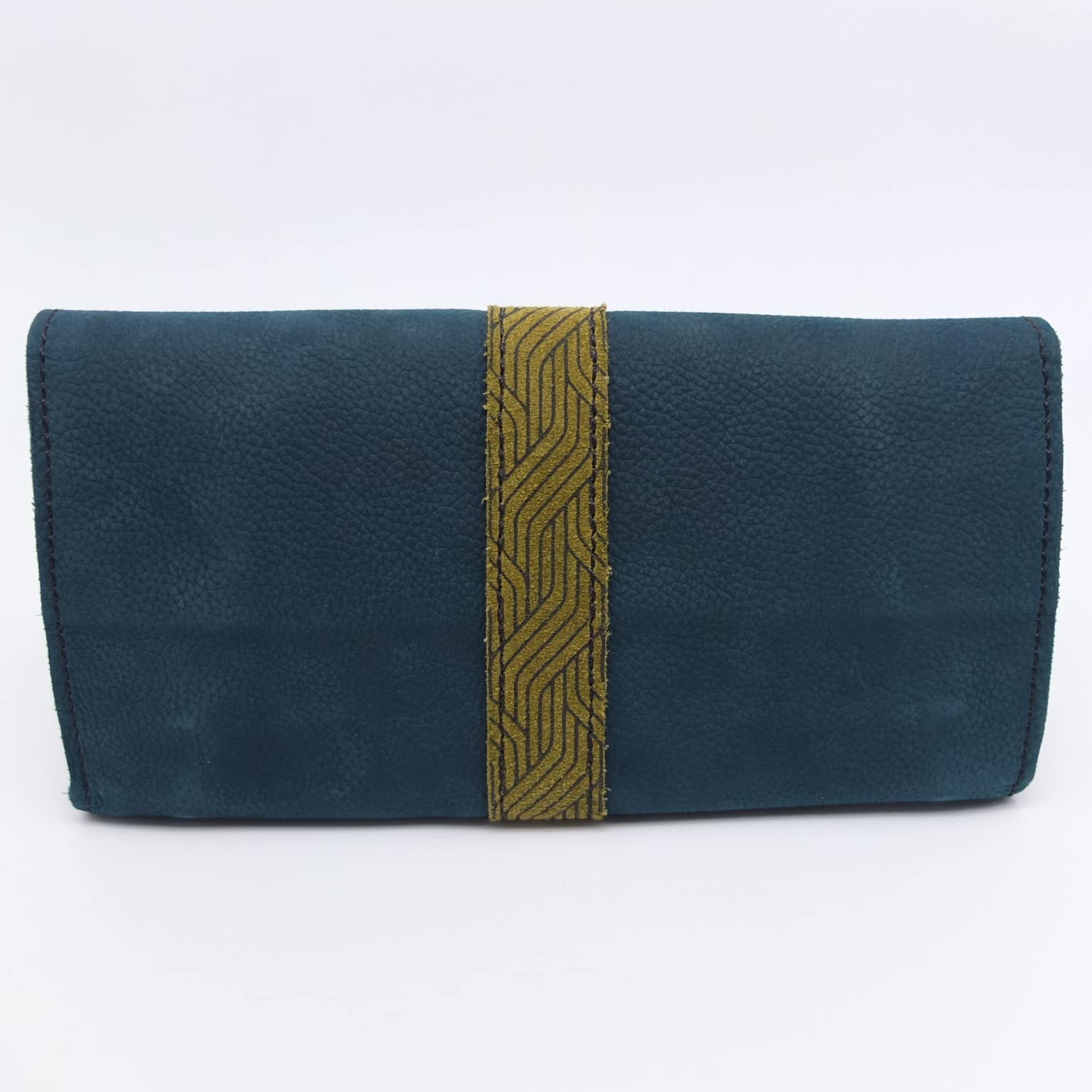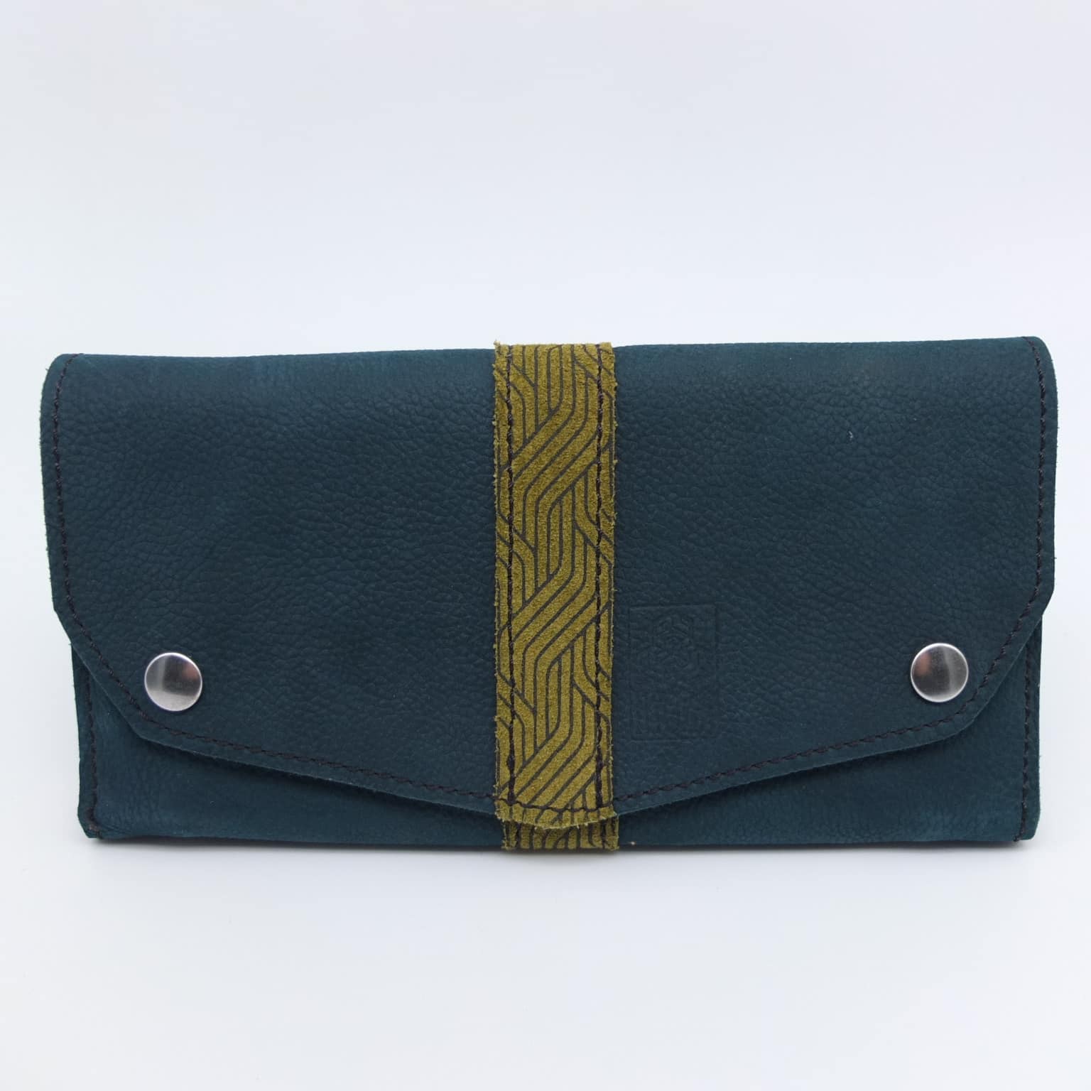 Compagnon en cuir bleu avec bande sérigraphiée verte – Élégance et praticité artisanale