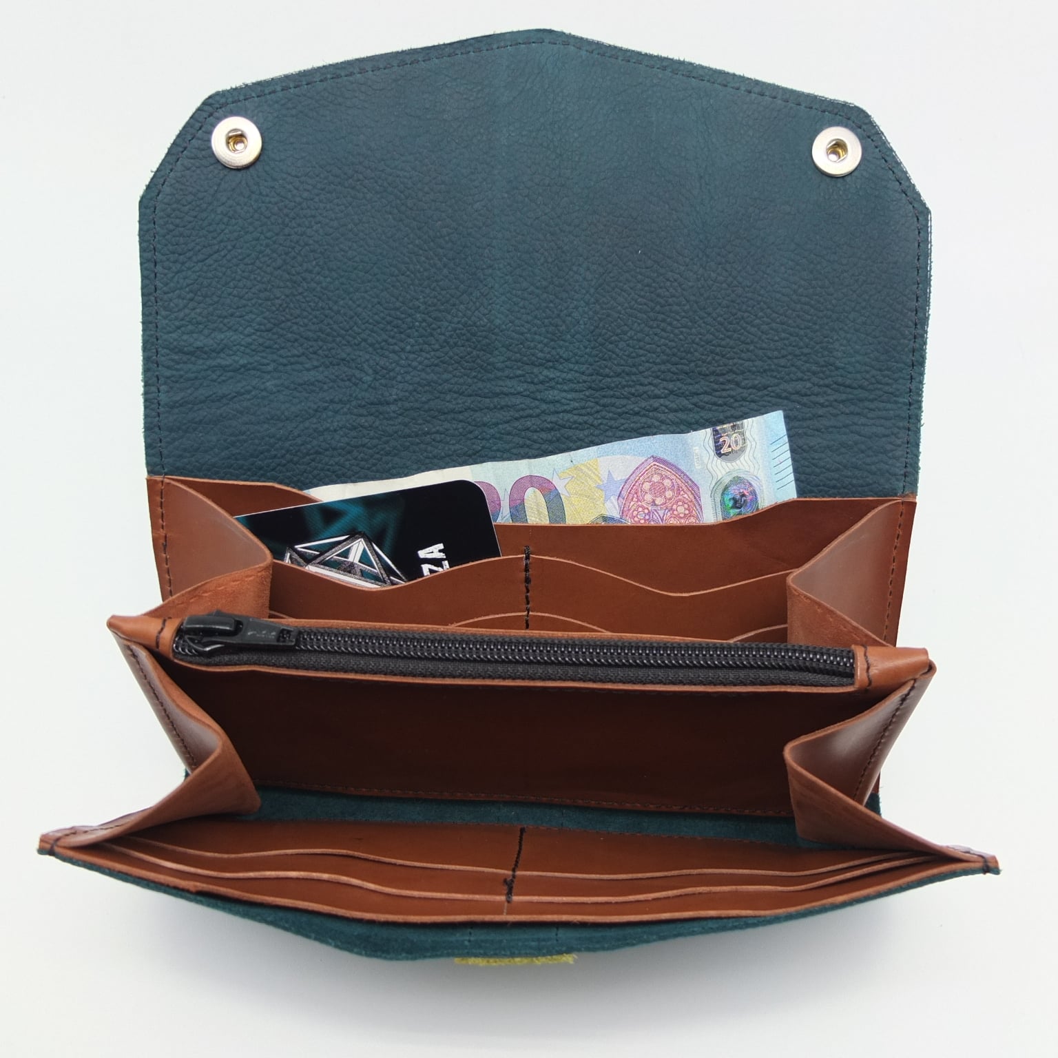 Description courte : Compagnon en cuir bleu avec bande sérigraphiée verte. Élégant et pratique, il offre une organisation optimale pour vos cartes, billets et pièces, tout en reflétant un savoir-faire artisanal unique.