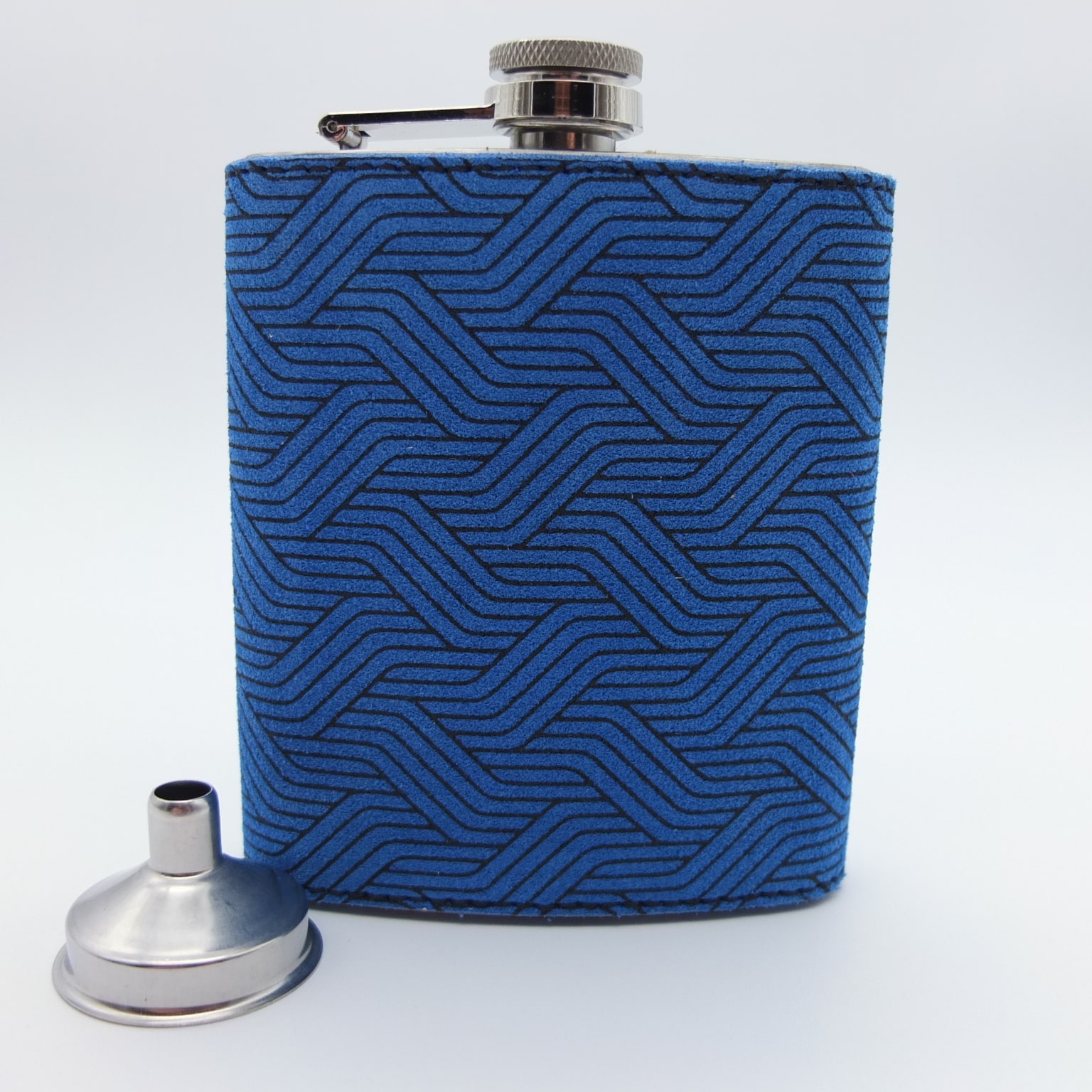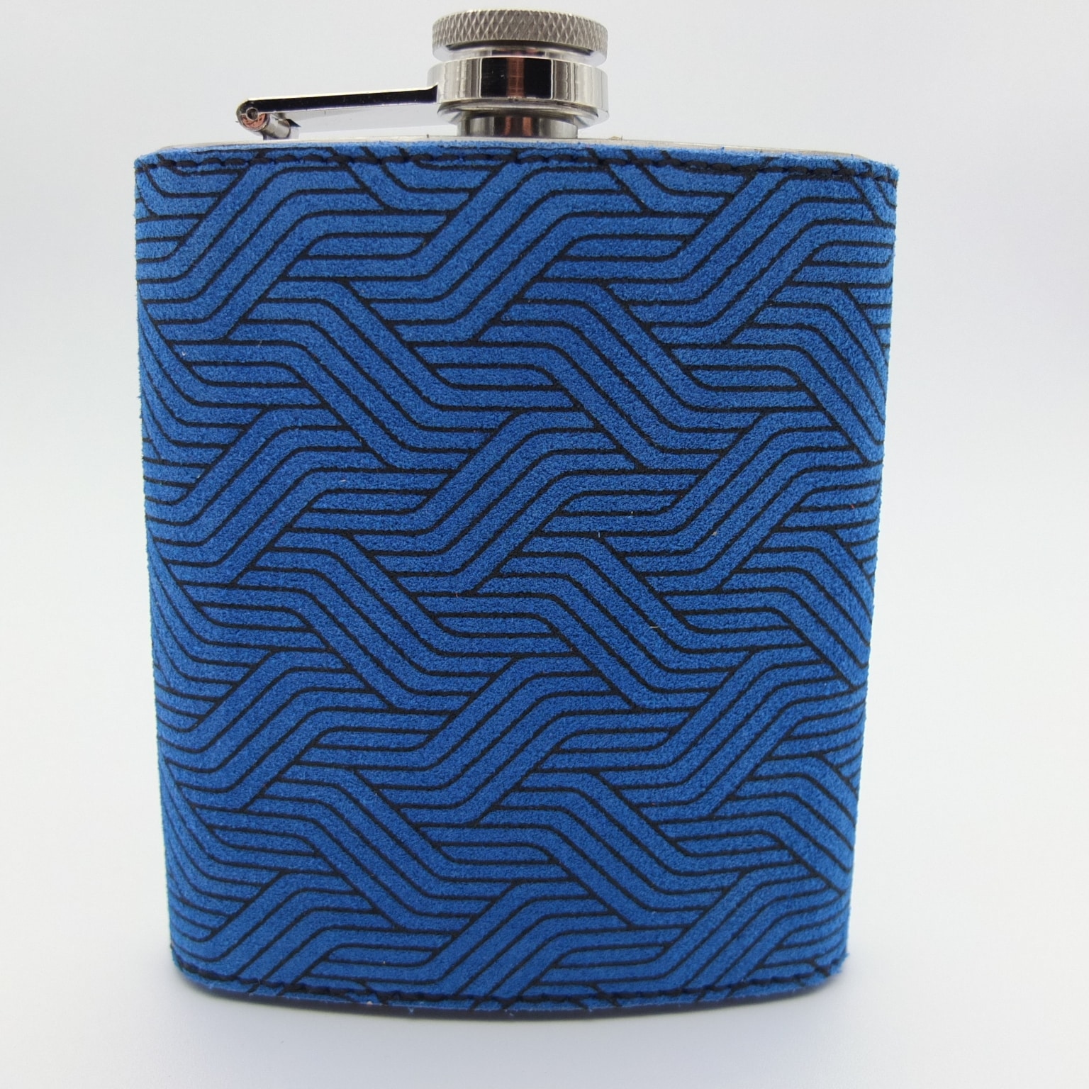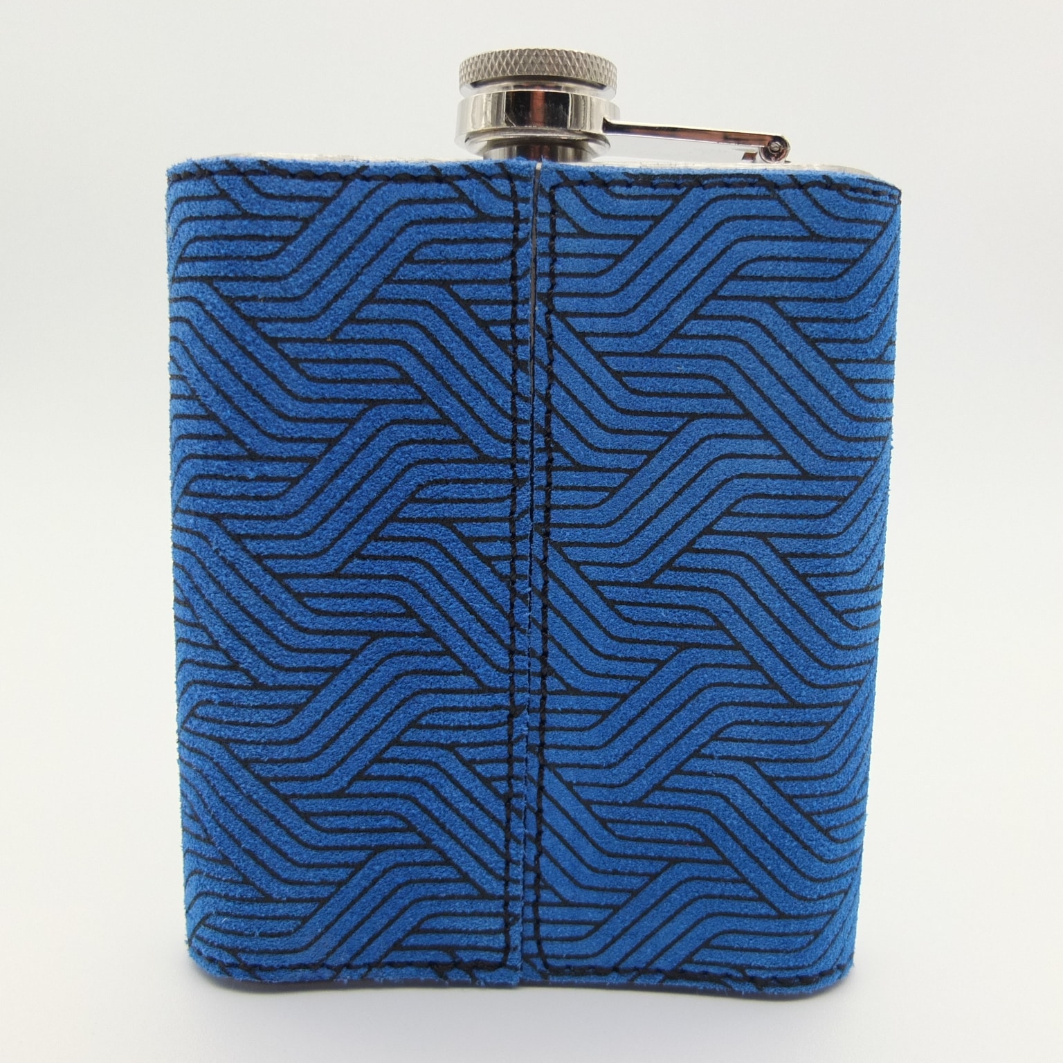 Découvrez cette flasque unique qui allie style et praticité. Habillée d’un cuir haut de gamme sérigraphié avec un motif géométrique bleu profond, cette pièce se distingue par son élégance et son design moderne. Chaque motif est soigneusement imprimé, créant un jeu harmonieux de symétrie et de couleurs qui attire le regard.