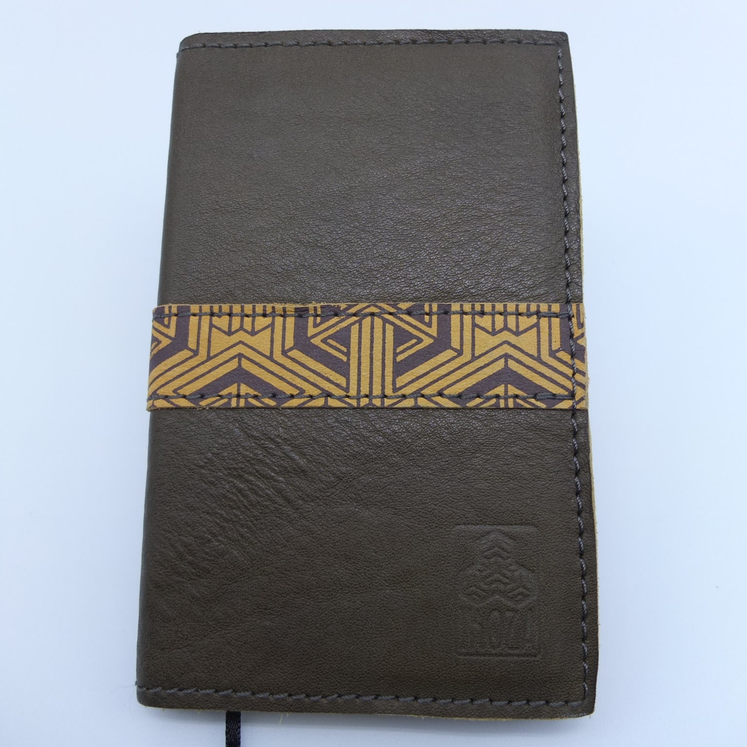 Découvrez l’élégance artisanale et la praticité réunies dans ce petit carnet en cuir kaki, sublimé par une bande sérigraphiée moutarde aux motifs géométriques uniques. Compact et raffiné, il s’adapte parfaitement à votre quotidien.
