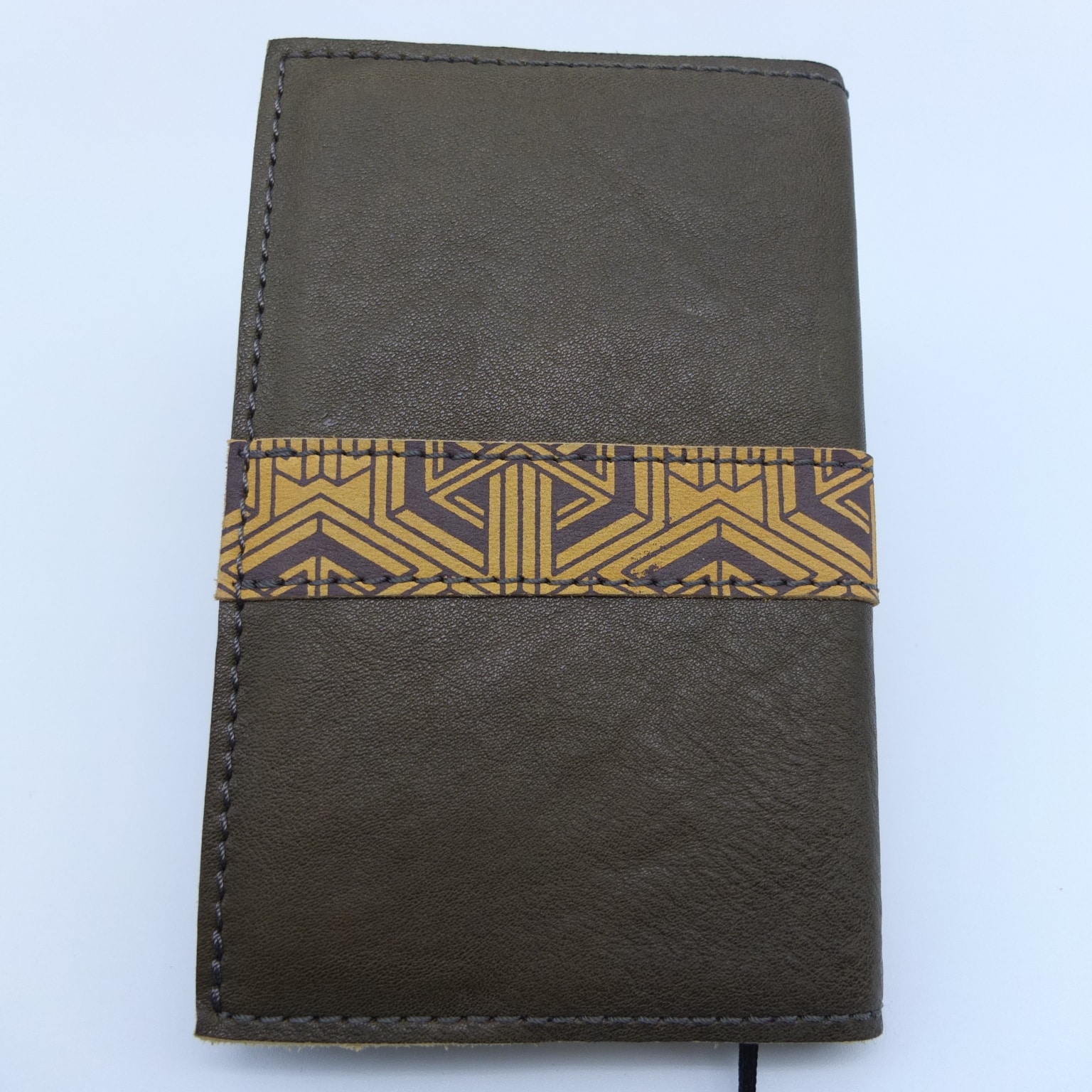 Description de produit : Petit carnet en cuir kaki avec bande sérigraphiée moutarde – Élégance et praticité artisanale