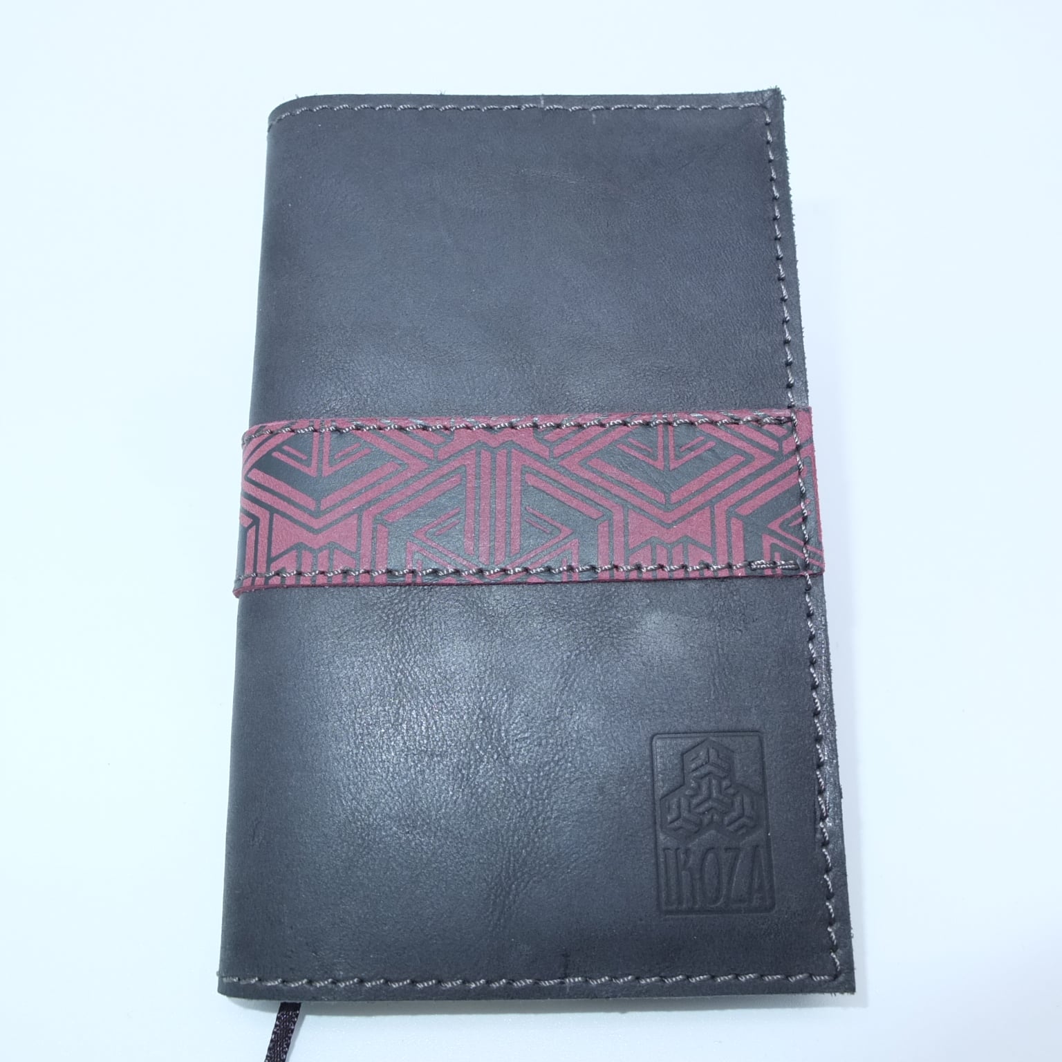 « Ce petit carnet en cuir noir, orné d’une bande sérigraphiée bordeau aux motifs géométriques, allie élégance artisanale et praticité. Compact et raffiné, il est parfait pour noter vos idées et organiser votre quotidien avec style. »