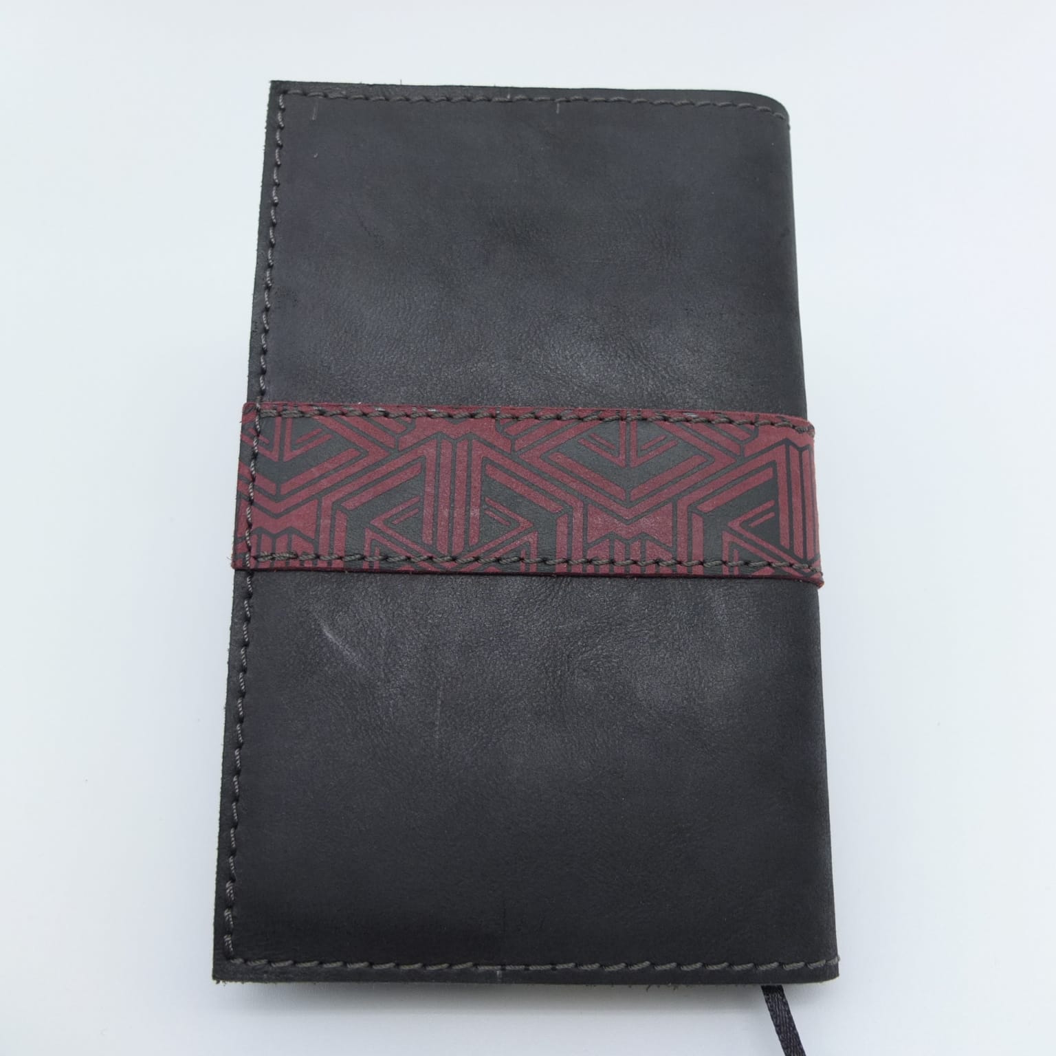 Découvrez l’élégance artisanale et la praticité réunies dans ce petit carnet en cuir noir, sublimé par une bande sérigraphiée bordeau aux motifs géométriques uniques. Compact et raffiné, il s’adapte parfaitement à votre quotidien.
