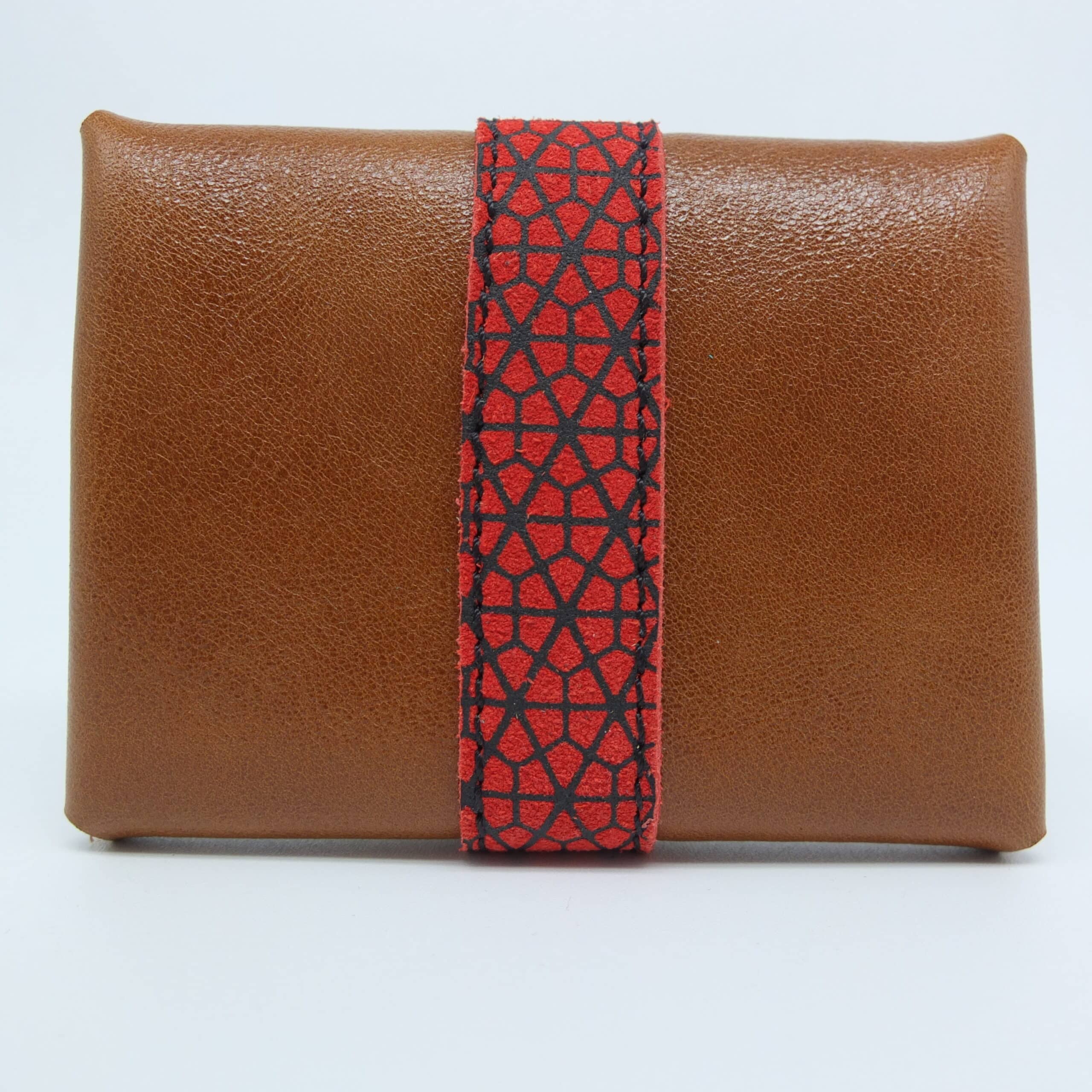 Apportez une touche d’artisanat raffiné à votre quotidien avec ce porte-cartes en cuir marron, orné d’une bande rouge sérigraphiée aux motifs géométriques. Conçu pour allier élégance et fonctionnalité, cet accessoire est parfait pour ranger cartes bancaires, de visite ou documents essentiels.