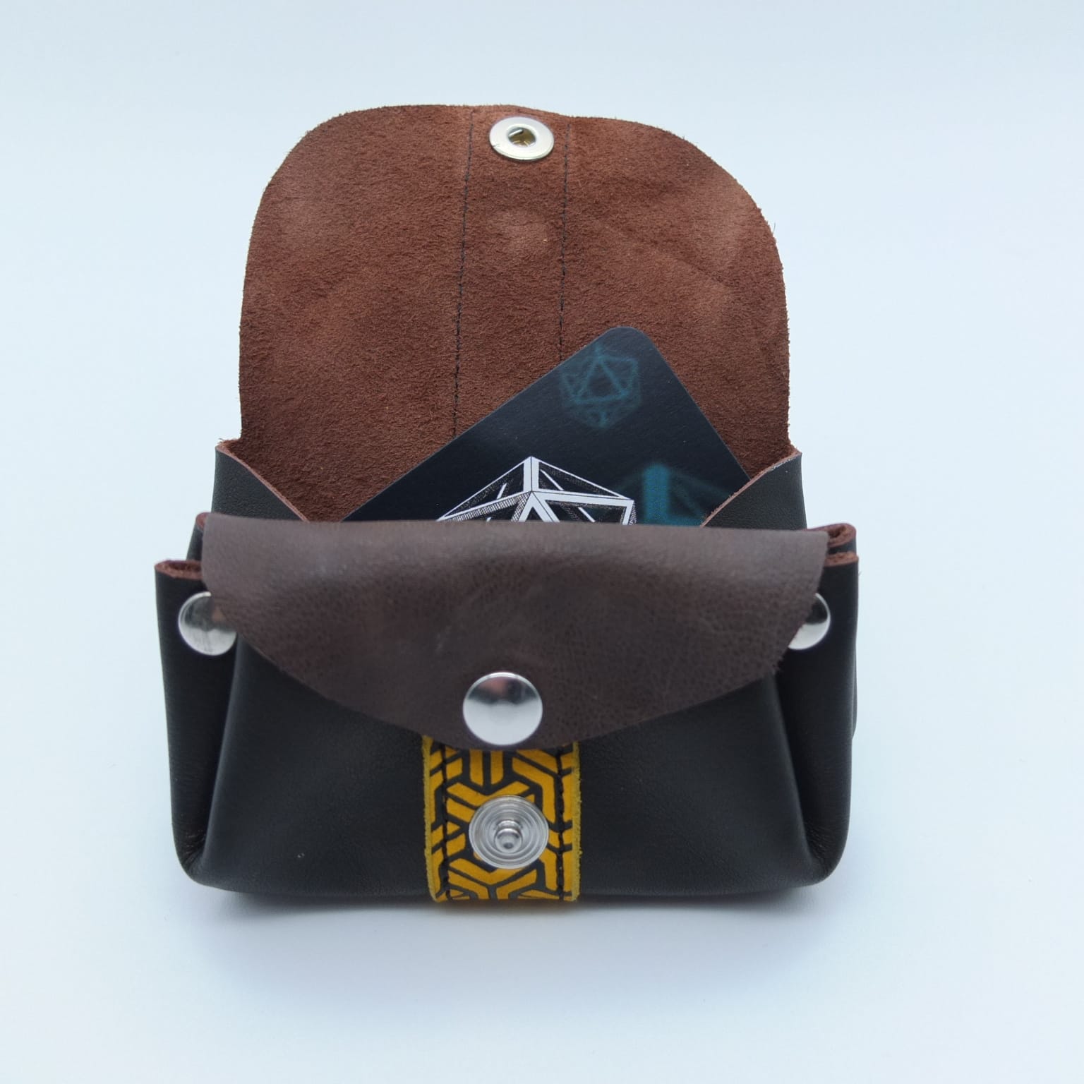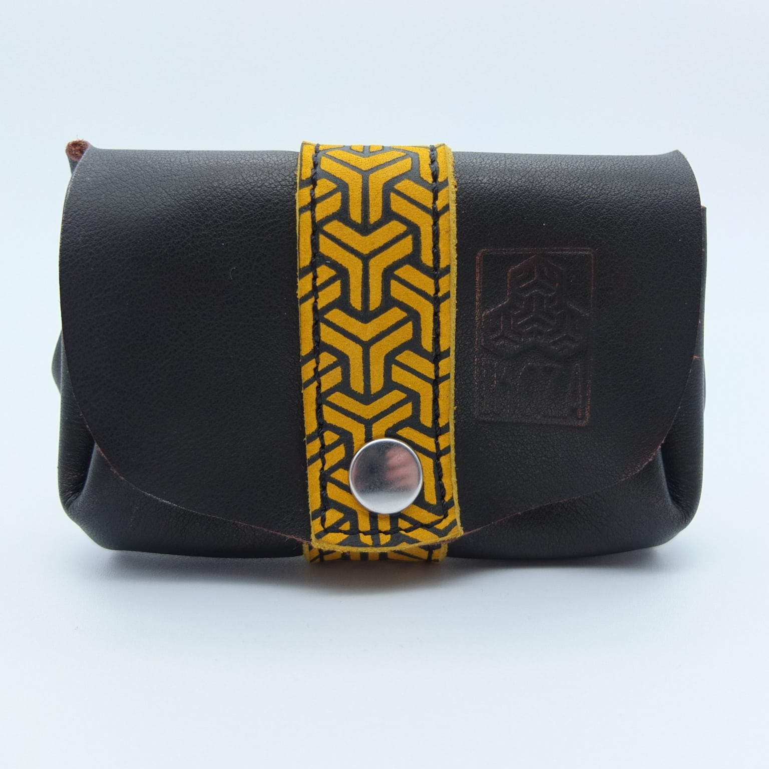 Porte-monnaie en cuir marron foncé sérigraphié – Motif géométrique jaune