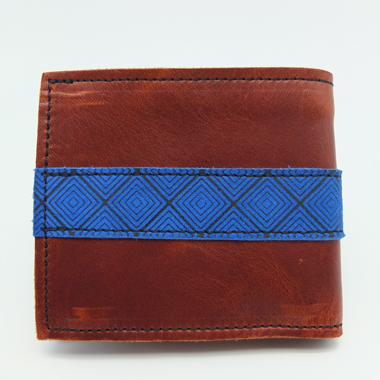Portefeuille en cuir marron avec bande sérigraphiée bleue – Motif géométrique bleu